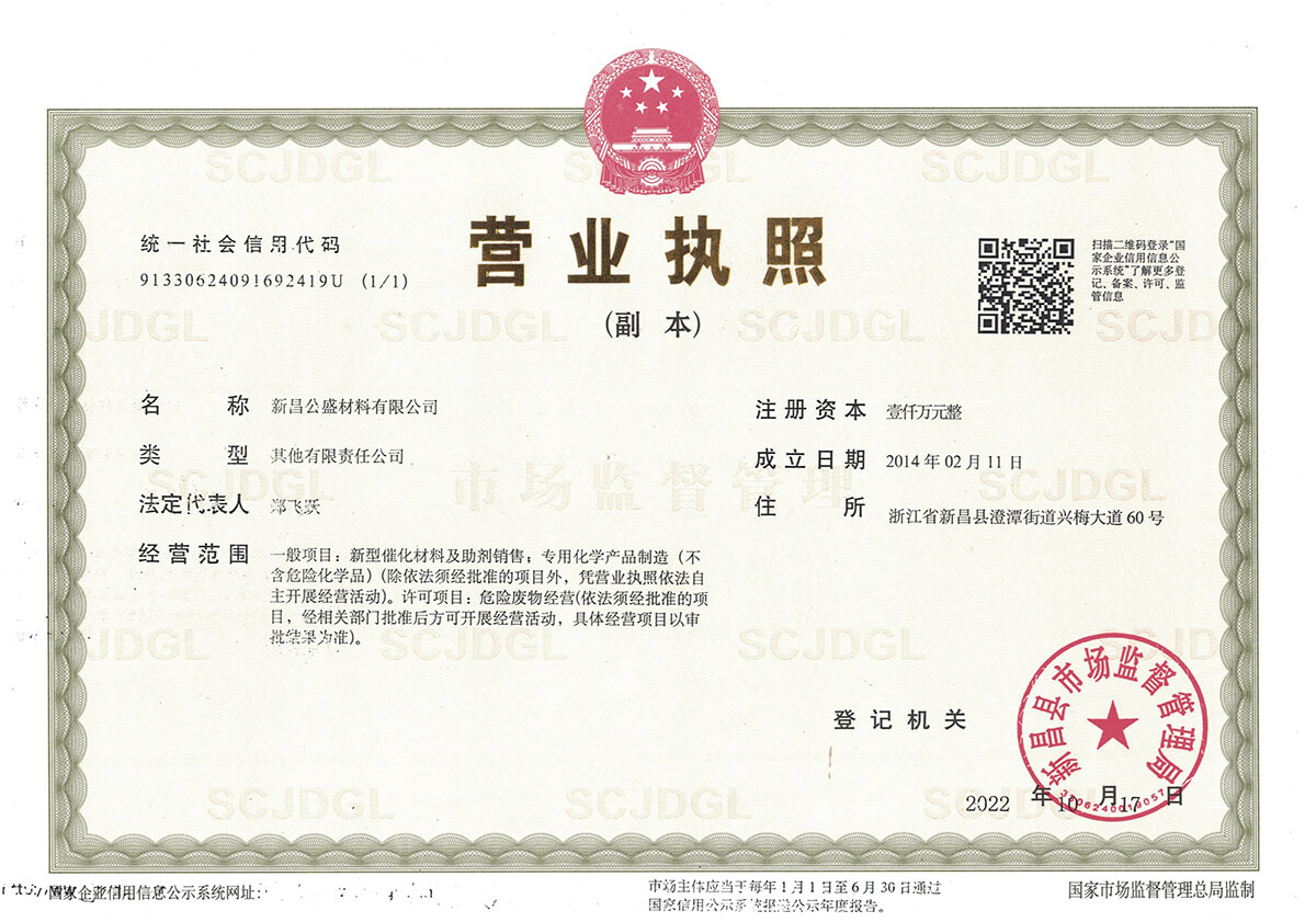 新昌公盛材料有限公司成立于2014年,坐落在江南大佛名城浙江新昌,地理位置優(yōu)越,交通便利,并配備有現代化的廠房和實驗樓,總占地面積80畝。公司聚焦于研發(fā)和生產用于醫(yī)藥、農藥、染料、材料等精細化工領域的貴金屬催化劑。目前主要從事鈀炭、鉑炭、釕炭等多項催化劑及醋酸鈀、DPPF二氯化鈀、雙三苯基膦二氯化鈀、四三苯基膦鈀、DBA鈀等均相催化劑的研發(fā)、生產、銷售以及失效鈀、失效鉑催化劑的回收再加工等業(yè)務。公司成立以來,一直以提升客戶產品的競爭力為經營宗旨,通過持續(xù)改進客戶所用催化劑的性能,來提高客戶產品的收率,提高催化劑的套用次數,提高失效催化劑的貴金屬回收率,來降低客戶產品中貴金屬催化劑的成本,進而提升客戶產品的競爭力。
